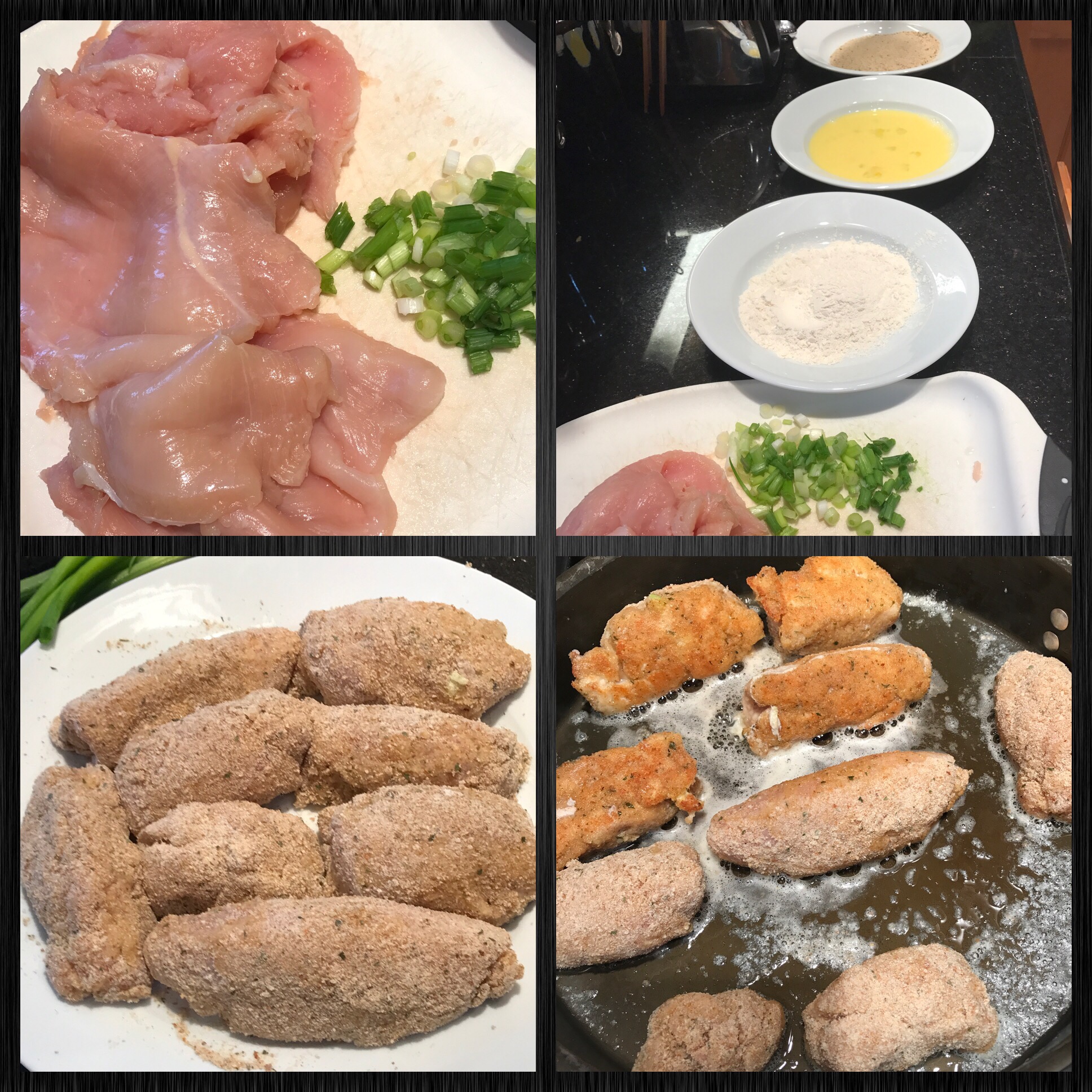Skin, halve lengthwise, and bone chicken breasts. Place 1 piece of chicken between two pieces of clear plastic wrap. Working from center to edges, pound lightly with a meat mallet, forming a rectangle about 1/8” thick. Remove plastic wrap; sprinkle chicken with some parsley and onion. Season with salt and pepper. Repeat with remaining chicken.