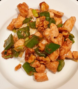 Return all chicken to wok or skillet. Stir soy mixture; stir into chicken. Cook and stir til thickened and bubbly. Stir in vegetables and walnuts; cover and cook 1 minute more (I never cover it). Serve at once with hot rice.