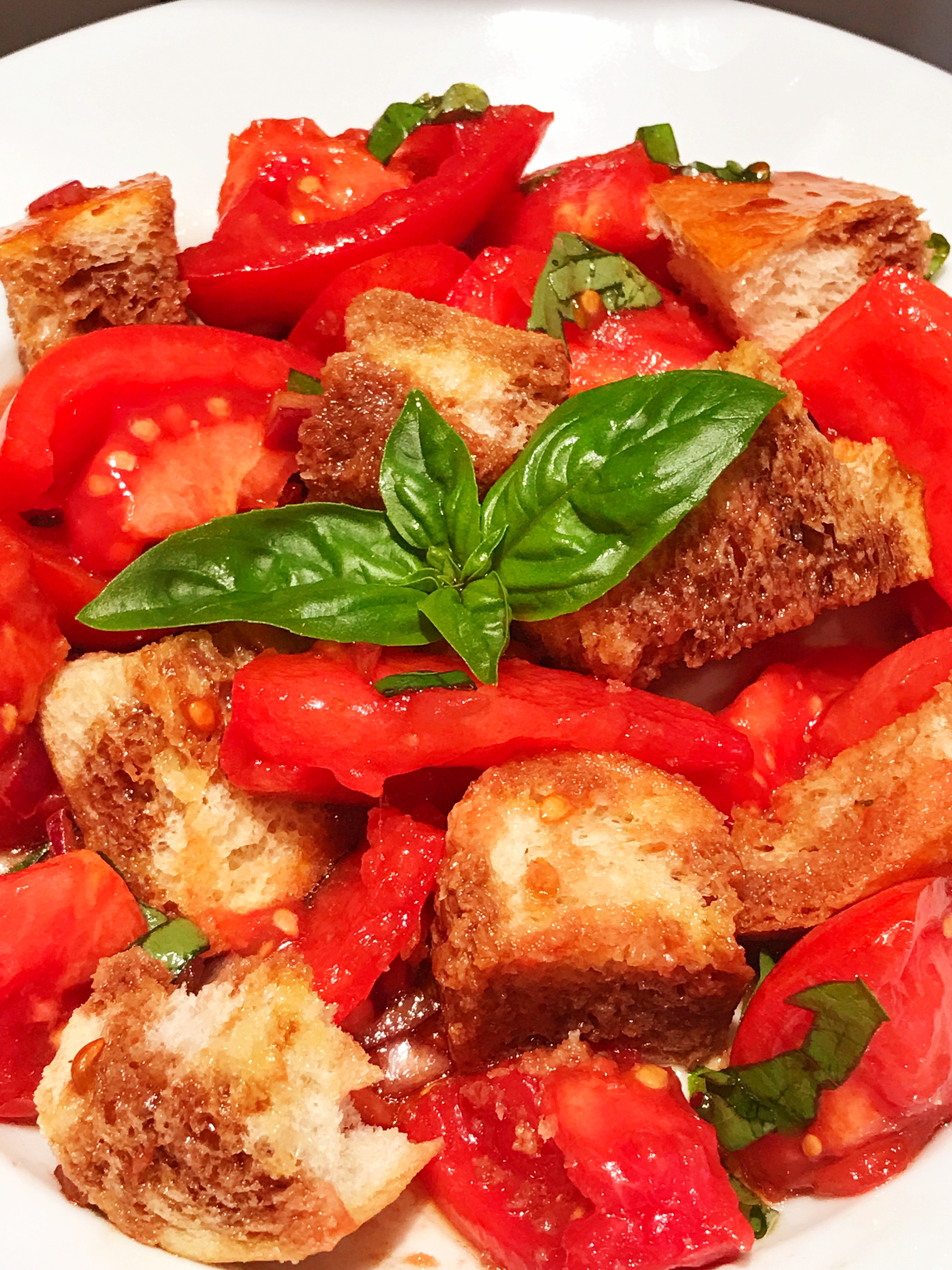 To serve, add the croutons, onion, and basil to the tomatoes. Whisk together the vinegar and oil for the vinaigrette. Pour over all and toss.