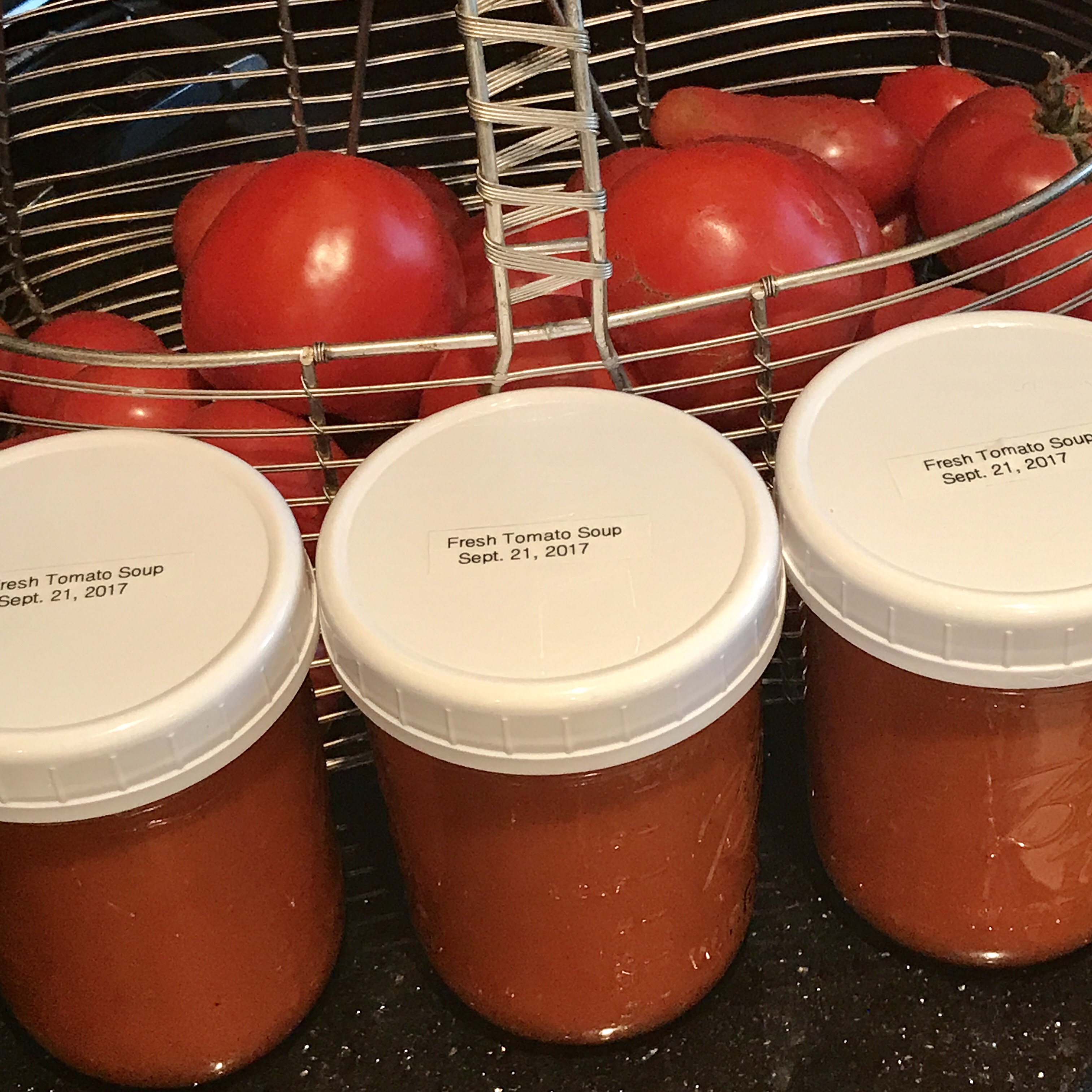 3 lbs. tomatoes yield 3 pints soup. Although I thought I would can these, any reference to Fresh Tomato Soup mentioned “fridge for 5 days or freezer for 6 months”