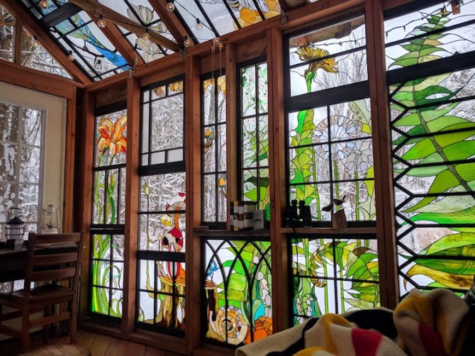“It is made almost entirely of reclaimed materials. Rafter beams from some fallen trees, lumber from a neighbor’s storm-damaged porch, and many, many old window frames. The cabin’s front-facing wall measures 8-feet by 12-feet. The cabin is small but the views from within are spectacular and kaleidoscopic,” explains Cooper. Indeed.