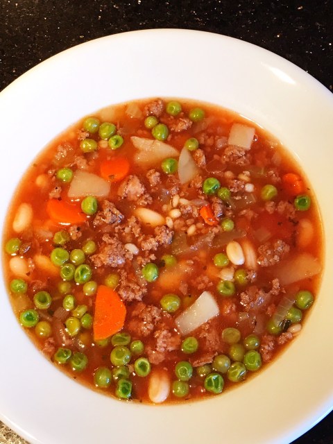 Soak beans in 10 cups of water overnight. Cook beans one hour. Brown and drain hamburger. Add to soup pot. In hamburger pan, saute onion & celery til softened; add to soup pot. Add carrots & potatoes to soup. Simmer 30 minutes. Add remaining ingredients and simmer 30 minutes more or until macaroni (or barley or whatever) is tender.Absolutely Wonderful! Kids LOVE it and it freezes well.