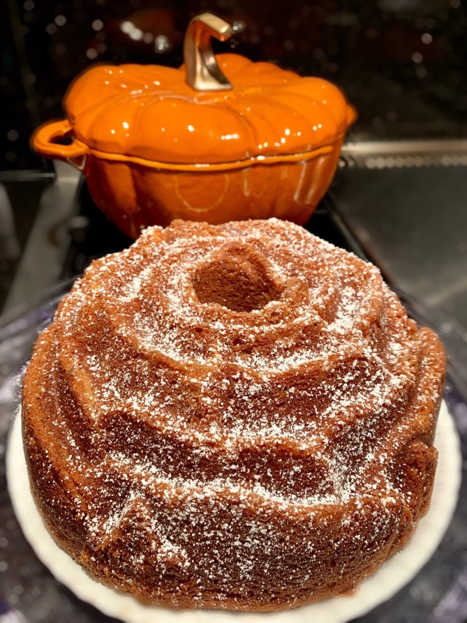 Pour into a greased and floured 10β bundt pan. Bake in a preheated 350 degrees for 50 minutes or tests done with toothpick.