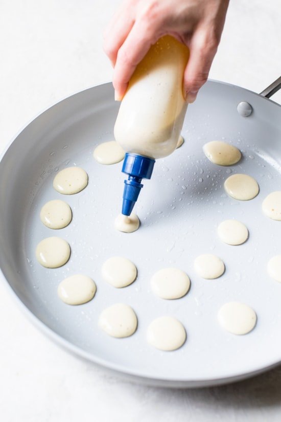 Pour pancake batter into a condiment squeeze bottle. (Or use a ziplock bag and cut a tiny whole in the corner as well.)