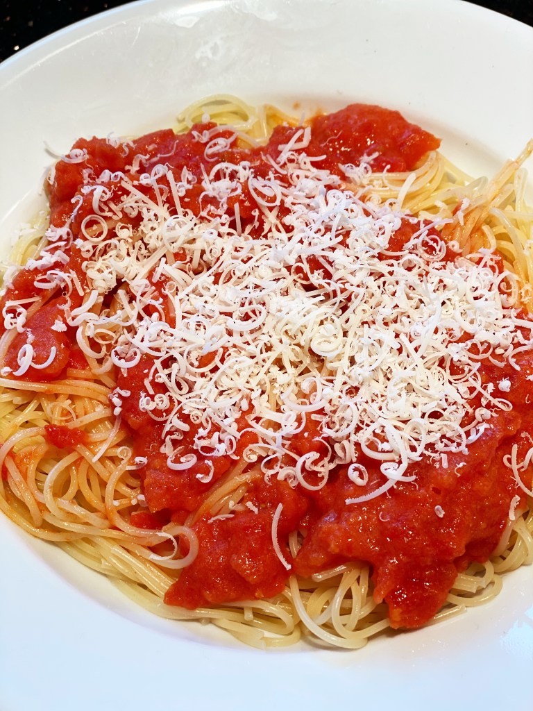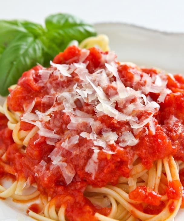 Simply toss the tomatoes, butter and onion in a saucepan over medium low heat. Season with salt and bring to a steady simmer. Allow the sauce to simmer for 45 minutes. Stir occasionally, making sure to scrape the sides of the pot. Adjust the seasoning and remove the onion (although I’m told it’s pretty delicious in its own right.)