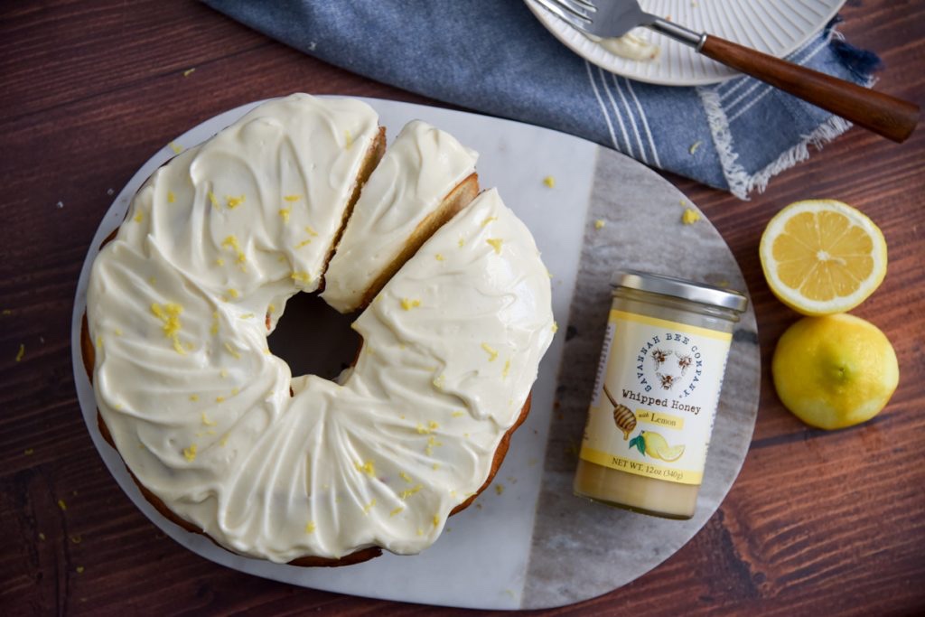 Cream together 1 cup of Philadelphia Cream Cheese with 1/2 cup of Lemon Whipped Honey (about 1/2 of the large jar). Drizzle over cake and sprinkle with lemon zest (optional).