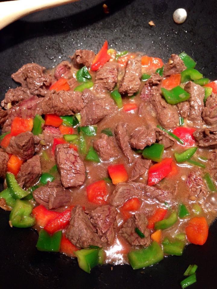 Heat oil in wok (or large non-stick skillet). Add beef and stir fry til browned. Turn heat up and add vegetables and stir fry til tender-crisp (about 10 minutes).