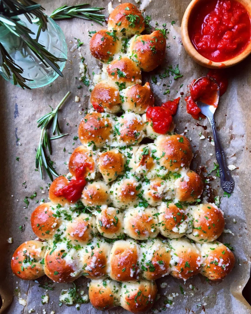 Preheat oven to 450°. Line a large baking sheet with parchment paper. Cut mozzarella sticks into 1” pieces and set aside. On a floured surface, divide pizza dough into two pieces. Stretch and roll each piece of dough into a long rectangle, then cut dough into 2” squares (you’ll need 33 total). Wrap a dough square around each piece of mozzarella, forming a tightly sealed ball. Place balls seam-side down on the baking sheet in the shape of a Christmas tree (they should be touching). Brush egg wash on dough balls and bake until golden about 20 minutes. Meanwhile, whisk together melted butter, Parmesan, garlic and herbs. Brush on baked pizza balls. Serve warm with marinara for dipping.