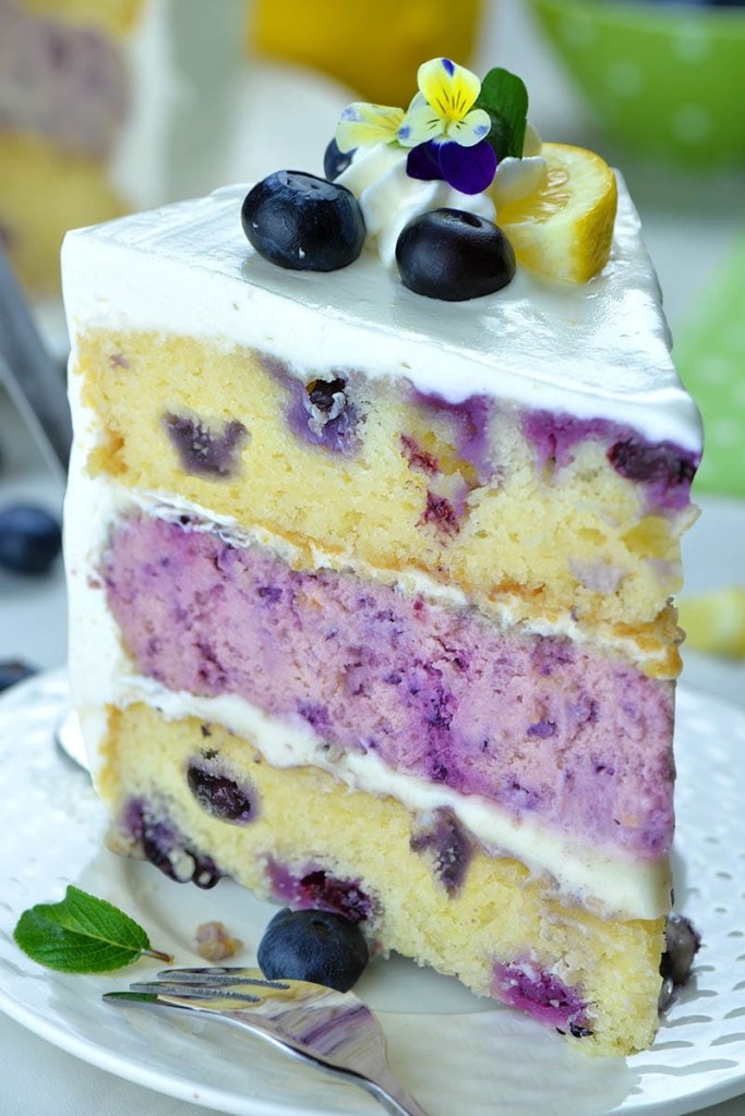 Place one layer of cake onto serving plate and top with thin layer of lemon cream cheese frosting. Place blueberry cheesecake layer and top with thin layer of frosting. Finally, top with second cake layer and frost cake with remaining frosting. Decorate with lemon wedges and fresh blueberries if desired. Refrigerate for at least 45 minutes before cutting or else the cake may fall apart as you cut.