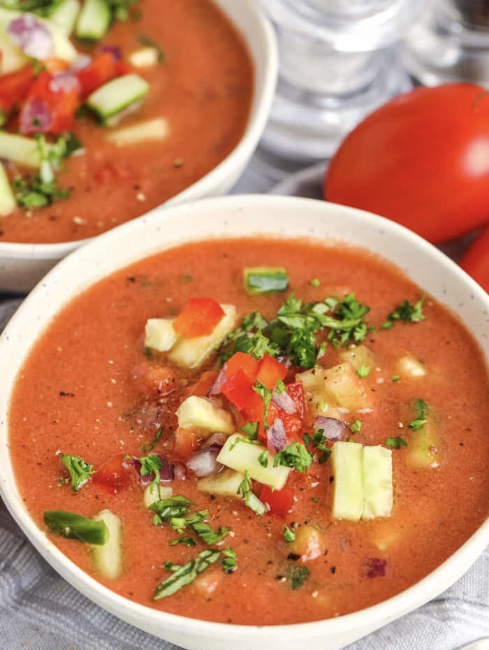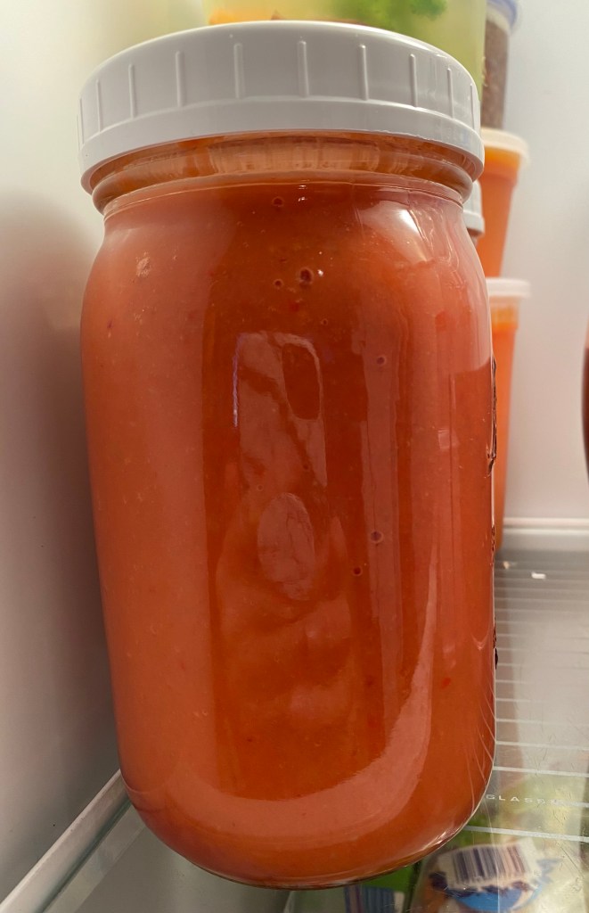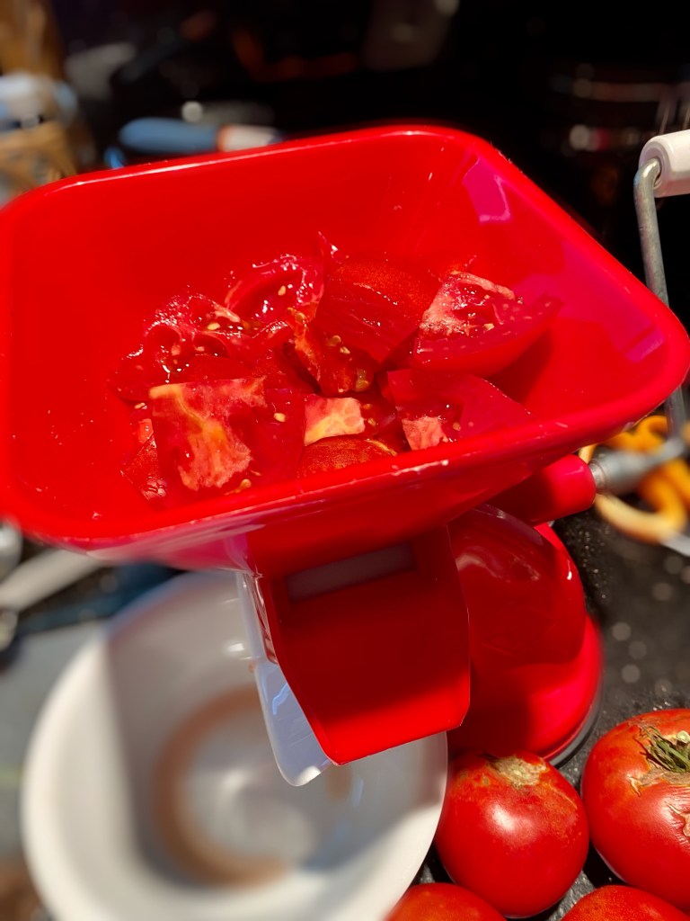 I purée in batches …My tomato press separates the seeds and skins from the pulpChillin’ that first hour in the fridge. Yields about 2 quarts