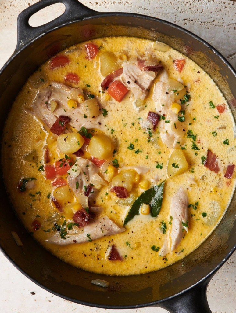 Dice a strip or two of bacon if you’re a meat eater, or grab some butter if you are not (or use both if you are reckless). Add it to a Dutch oven set over medium-high heat and sauté with a few handfuls of diced onions, carrots and potatoes until the onions have gone translucent. Hit the mixture with some salt and pepper and a flash of smoked paprika if you have it. If you can find good corn on the cob, that would be a fine addition. So would a cup of frozen corn.